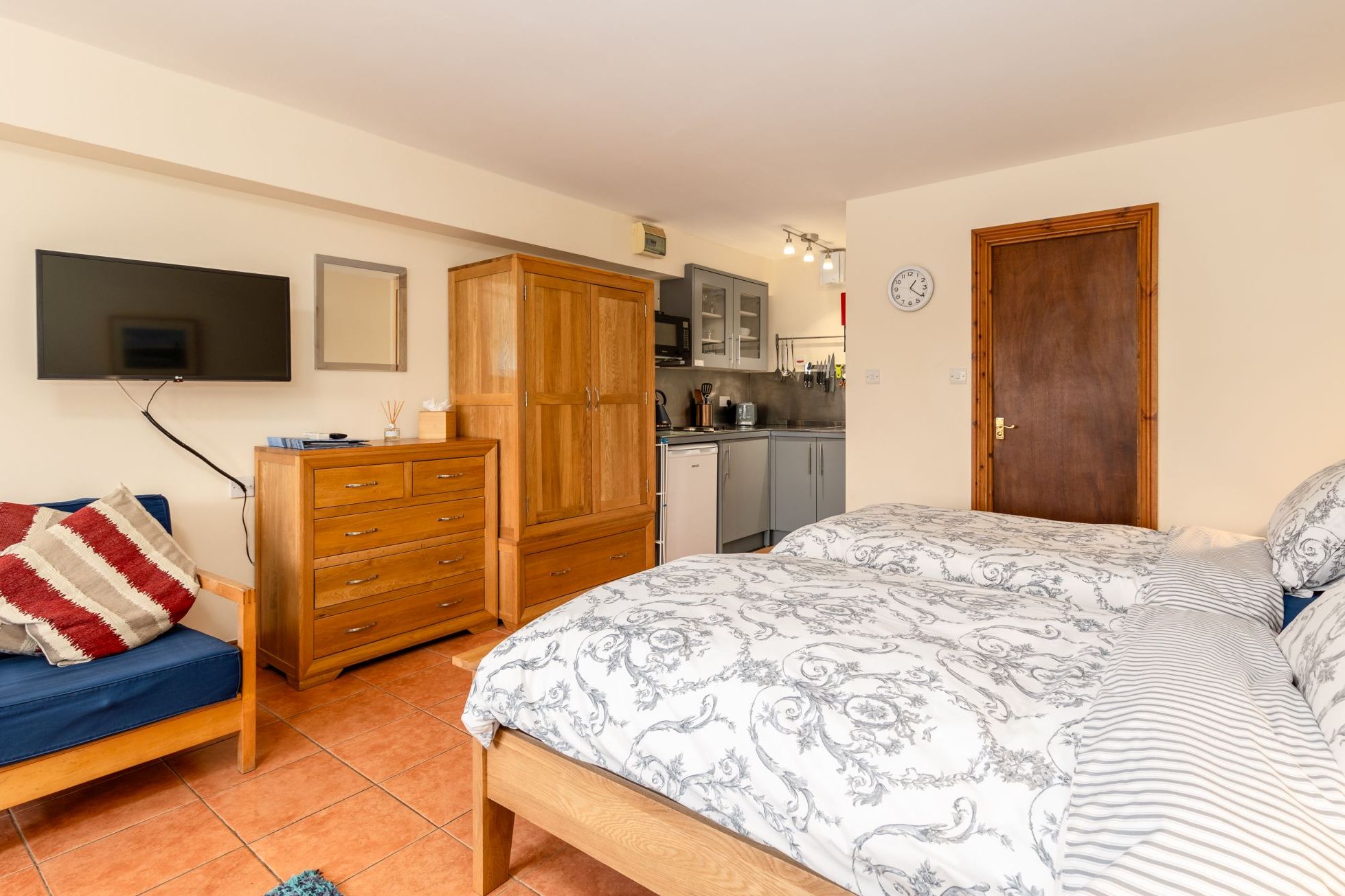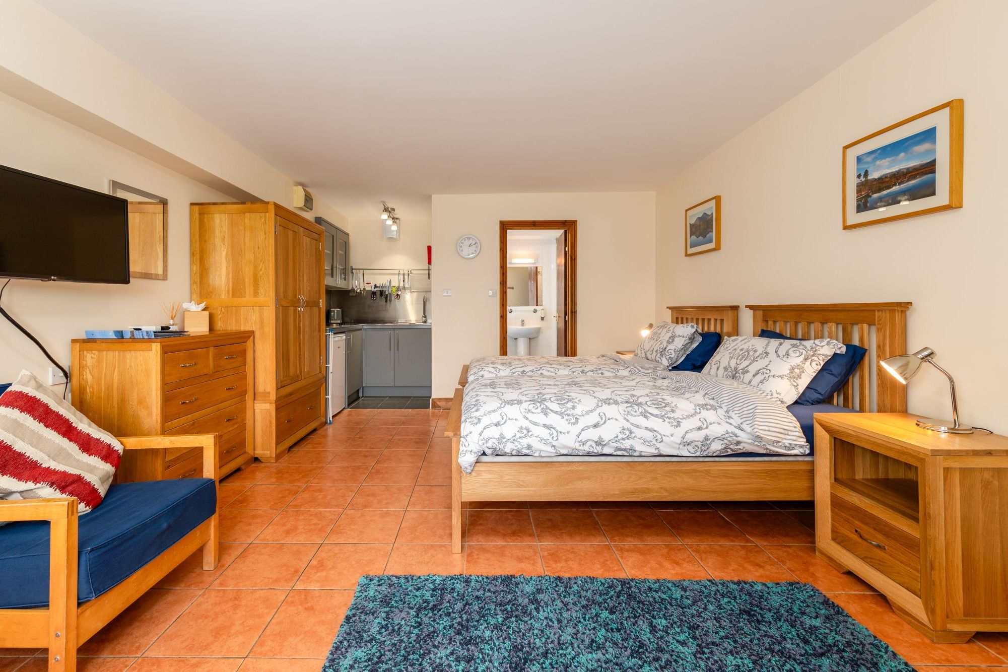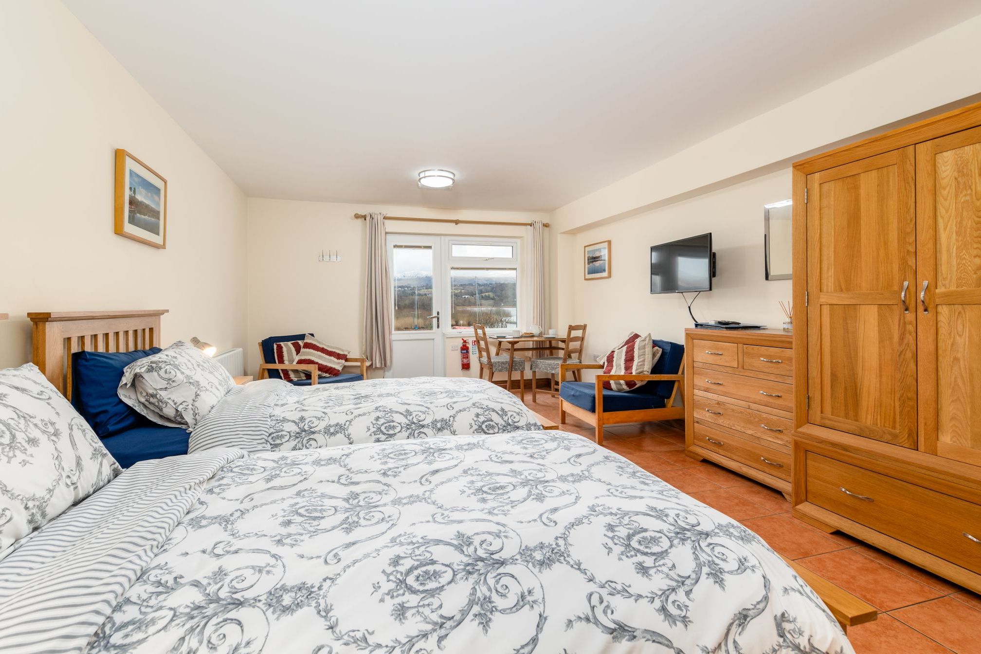 Our twin bed studio is open-plan with a well-equipped kitchenette, dining area and separate modern shower room. Each studio also has small patio area with table and chairs overlooking the marina and lake.