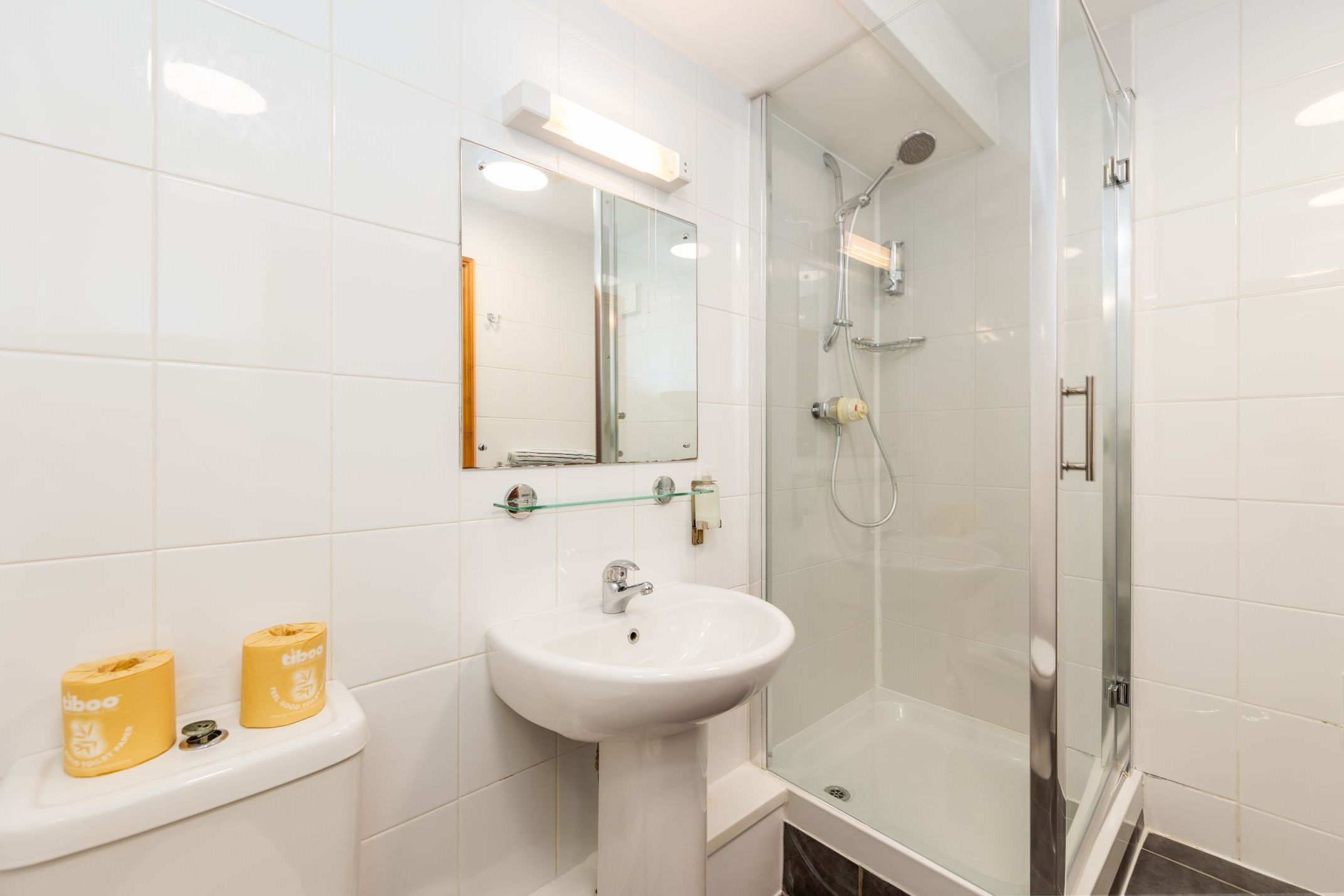 - Shower room with toilet, sink, mirror and heated towel rail.